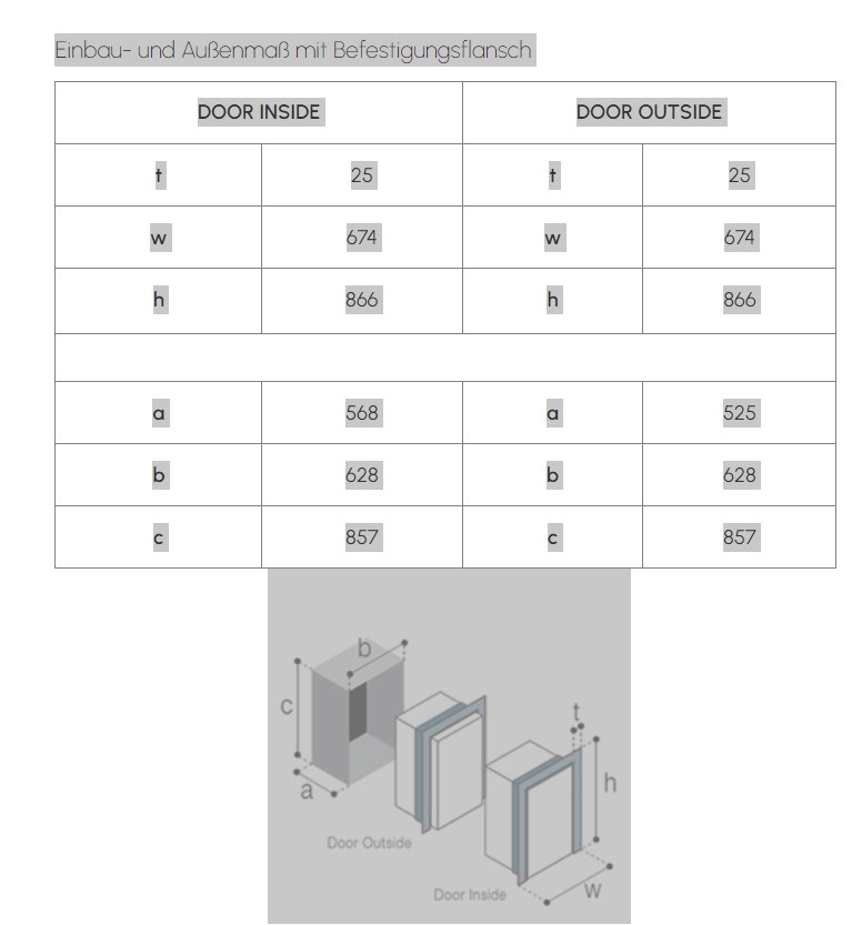 | Einbaurahmen: | serienmäßig, für Einbau in Position DOOR INSIDE oder DOOR OUTSIDE |