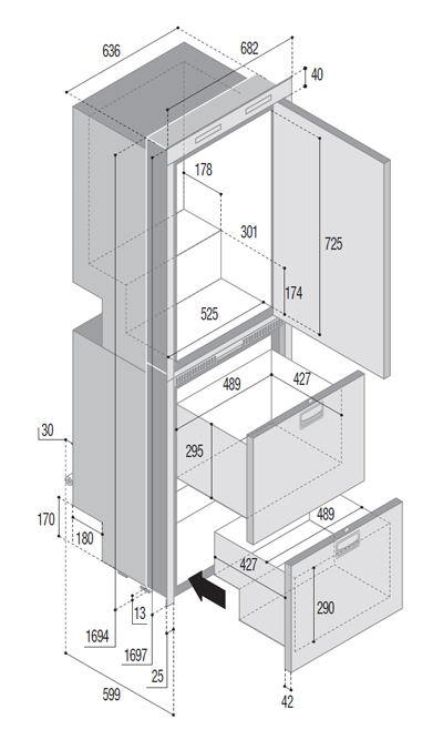 Vitrifrigo DW360 OCX2 DTX Premium Kühl-Gefrier-Kombination: Kühlschrank oben, Gefrierschublade in der Mitte, Kühlschublade unten