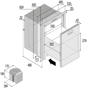 Geräte-Abmessungen DW75L OCX2 Auszug Kühlschrank Einbau- Abmessungen mit Einbaurahmen